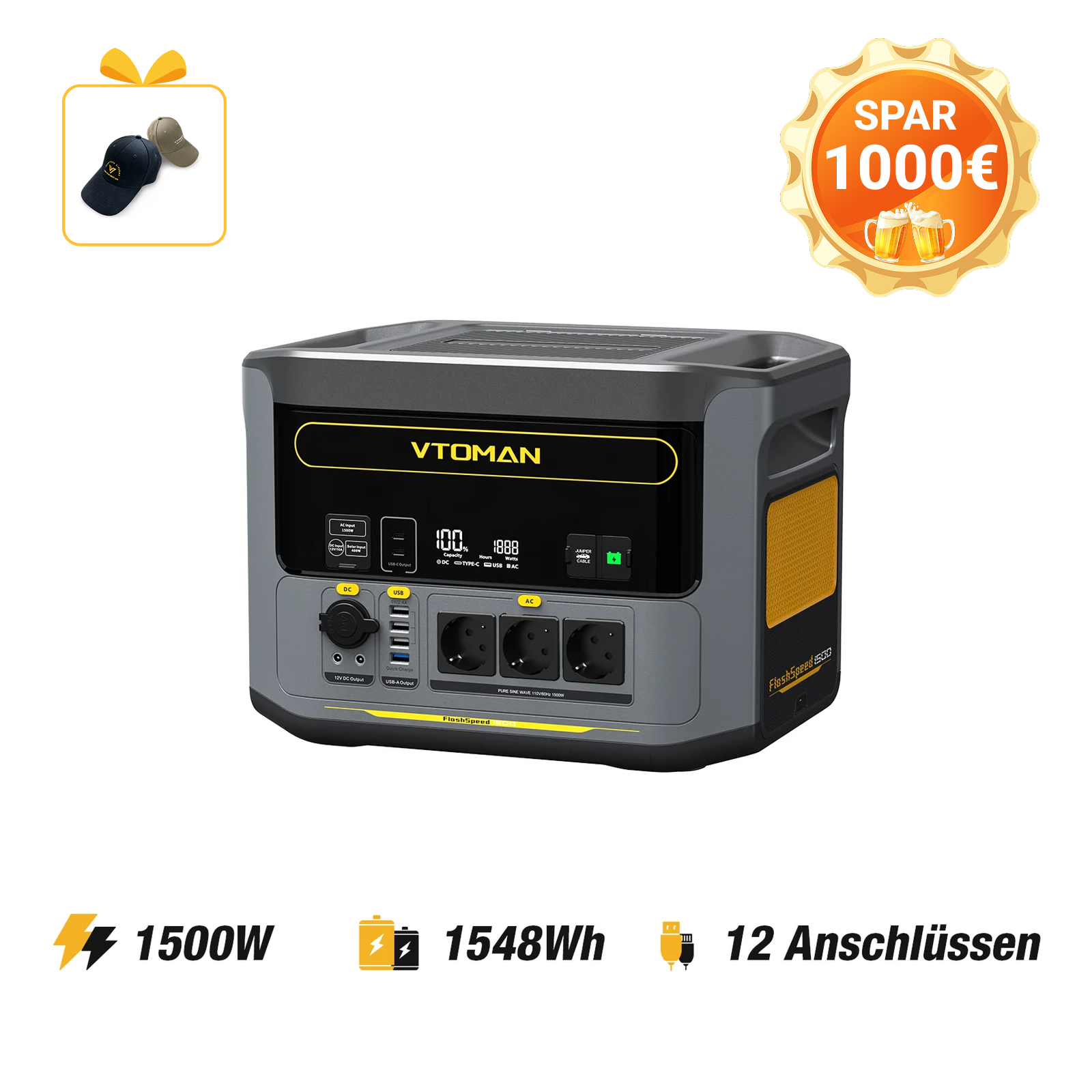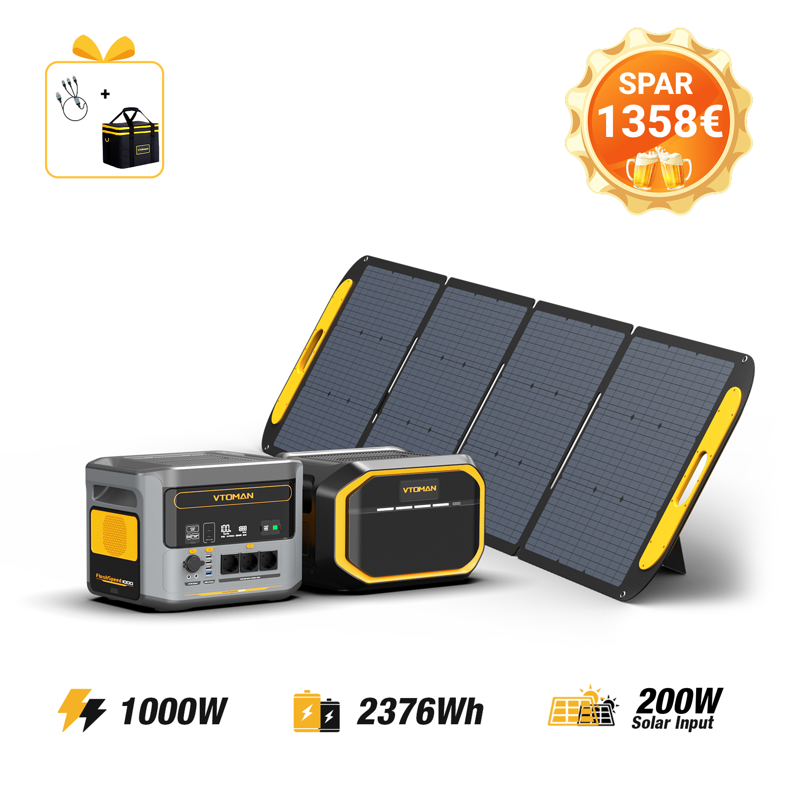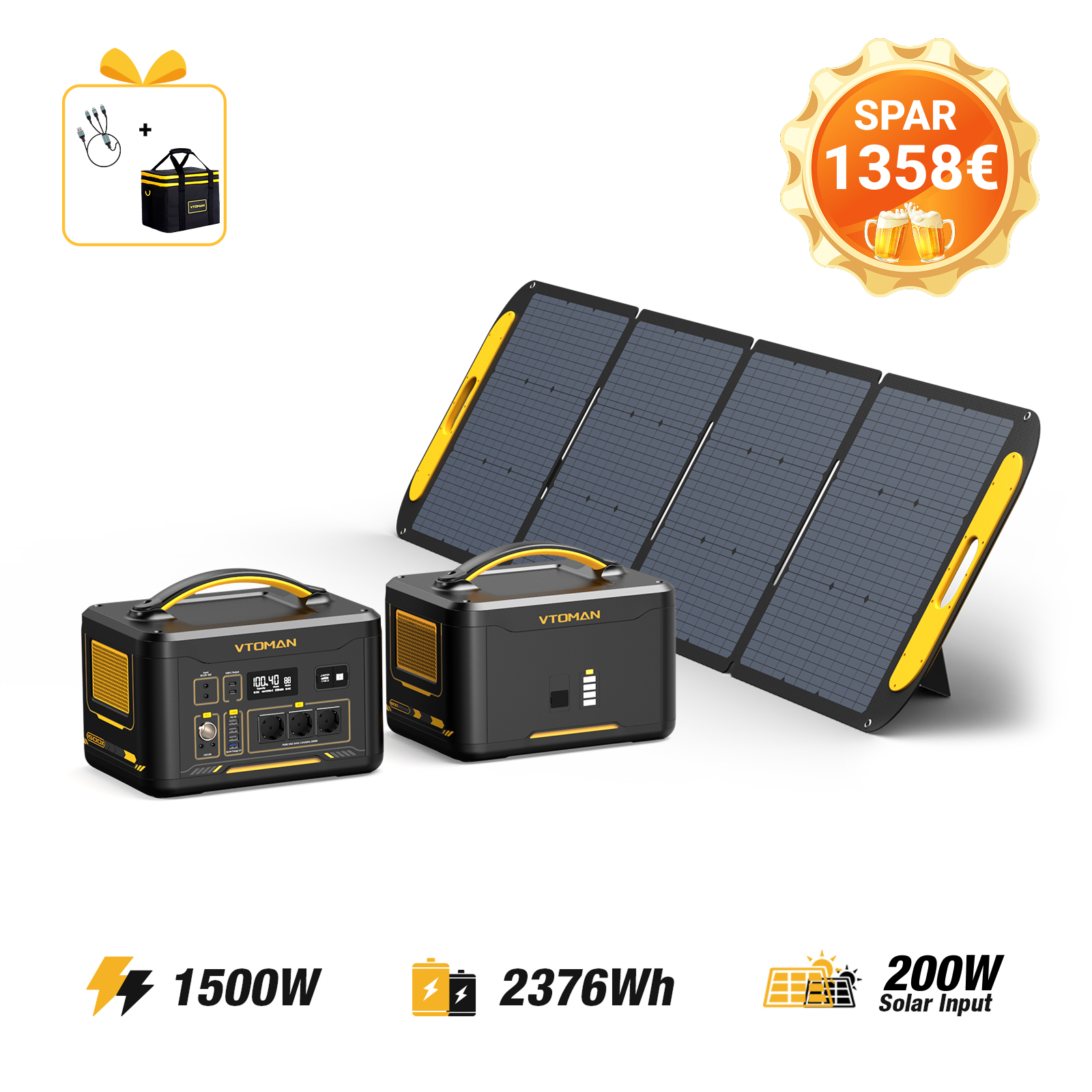 Das VTOMAN Solar Generator Kit kombiniert eine leistungsstarke Powerstation mit Solarmodulen. Es bietet zuverlässige und erneuerbare alternative Energielösungen, indem es entweder Sonnenenergie oder Elektrizität in gespeicherte Energie umwandelt, um den Anforderungen verschiedener Bedürfnisse gerecht zu werden. Zusätzliche Batterien sind ebenfalls erhältlich, um eine größere Energiespeicherkapazität oder flexible Kombinationen je nach Bedarf zu ermöglichen - die beste Wahl für Outdoor-Abenteuer, Stromausfall-Backup, professionelle Nutzung usw.